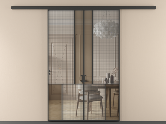Во всех алюминиевых перегородках, независимо от типа установки, используется компланарный раздвижной механизм, благодаря которому декоративная крышка и полотно находятся в одной плоскости.