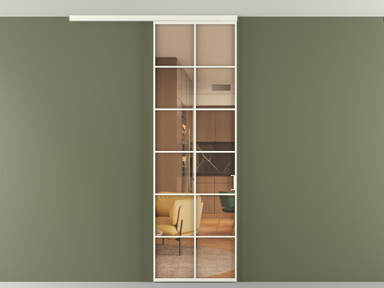 Во всех алюминиевых перегородках, независимо от типа установки, используется компланарный раздвижной механизм, благодаря которому декоративная крышка и полотно находятся в одной плоскости.