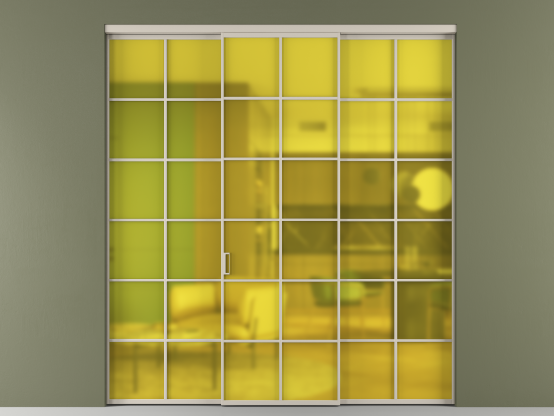Во всех алюминиевых перегородках, независимо от типа установки, используется компланарный раздвижной механизм, благодаря которому декоративная крышка и полотно находятся в одной плоскости.