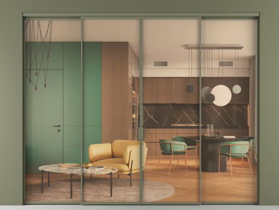 Алюминиевые перегородки имеют единый профиль с алюминиевыми дверьми и легко сочетаются в одном пространстве, не перегружая его. Также их можно комбинировать в интерьере с полотнами из нашего стандартного ассортимента. Помимо этого, система алюминиевых перегородок и дверей координируется со стеновыми панелями Волховец.