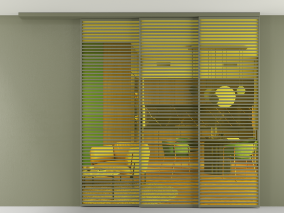Дополнительно на раздвижную двустворчатую перегородку вдоль стены и четырёхстворчатую перегородку внутри проёма с двумя неподвижным полотнами можно установить механизм синхронного открывания — при открывании одной створки, вторая открывается автоматически.