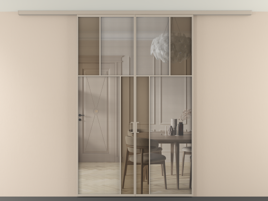 Дополнительно на раздвижную двустворчатую перегородку вдоль стены и четырехстворчатую перегородку внутри проема с двумя неподвижным полотнами можно установить механизм синхронного открывания — при открывании одной створки, вторая открывается автоматически.