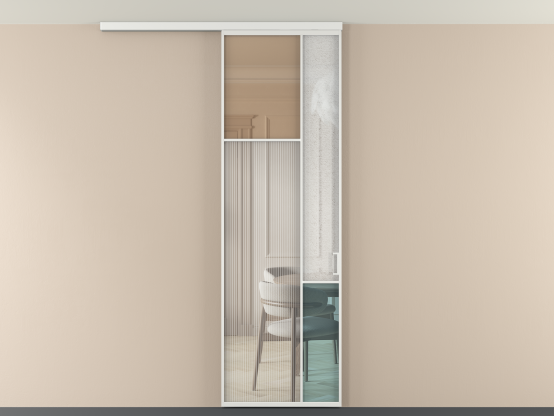 Во всех алюминиевых перегородках, независимо от типа установки, используется компланарный раздвижной механизм, благодаря которому декоративная крышка и полотно находятся в одной плоскости.