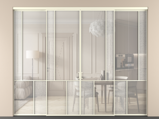 Дополнительно на раздвижную двустворчатую перегородку вдоль стены и четырехстворчатую перегородку внутри проема с двумя неподвижным полотнами можно установить механизм синхронного открывания — при открывании одной створки, вторая открывается автоматически.