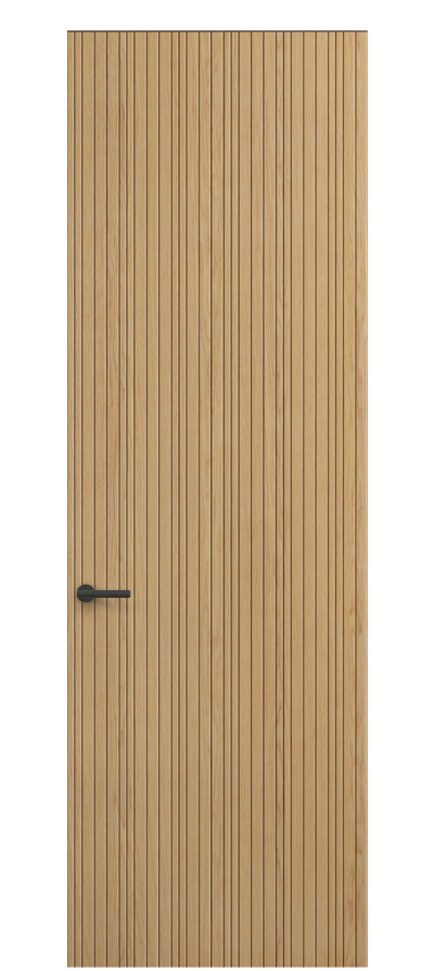 SELECT — коллекция минималистичных дверей с фрезеровкой по натуральному шпону. Рельеф на поверхности полотна создаёт игру света и тени, добавляя пространству динамичности и визуального объёма. Двери SELECT в сочетании со стеновыми панелями и мебельными фасадами, повторяющими лаконичный дизайн, создают единое стилевое решение.