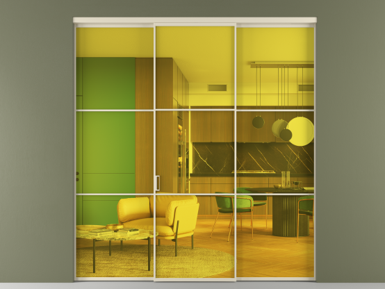 Мы предлагаем девять вариантов декоративного стекла: от кристально-прозрачного до матовых цветных, а также стёкла с эффектом Stopsol, когда лицевая сторона стекла зеркальная, но при включенном освещении за стеклом — становится прозрачной.