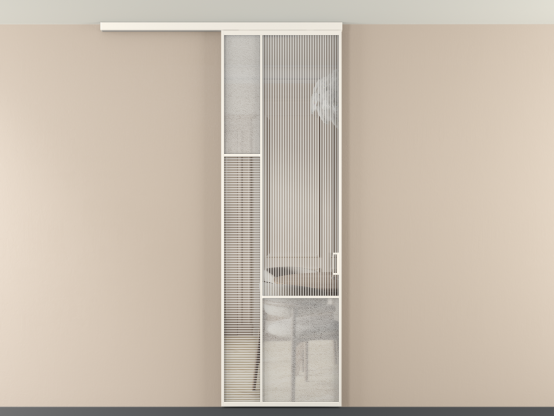 Во всех алюминиевых перегородках, независимо от типа установки, используется компланарный раздвижной механизм, благодаря которому декоративная крышка и полотно находятся в одной плоскости.
