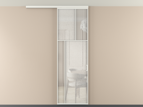 Во всех алюминиевых перегородках, независимо от типа установки, используется компланарный раздвижной механизм, благодаря которому декоративная крышка и полотно находятся в одной плоскости.