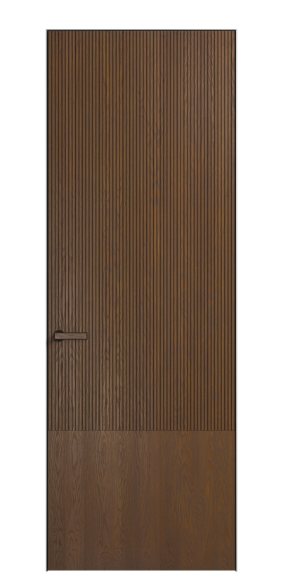 Это полотна с рельефной фрезеровкой. Этот прием делает интерьер объемным, тактильным, вносит интересную текстуру и создает современный образ. Волнистый рельеф может быть выполнен по ламелям из массива дуба в древесных матовых отделках, либо исполнен по натуральному и экологически безопасному материалу — ХДФ, покрытому гладкой эмалью актуальных оттенков.